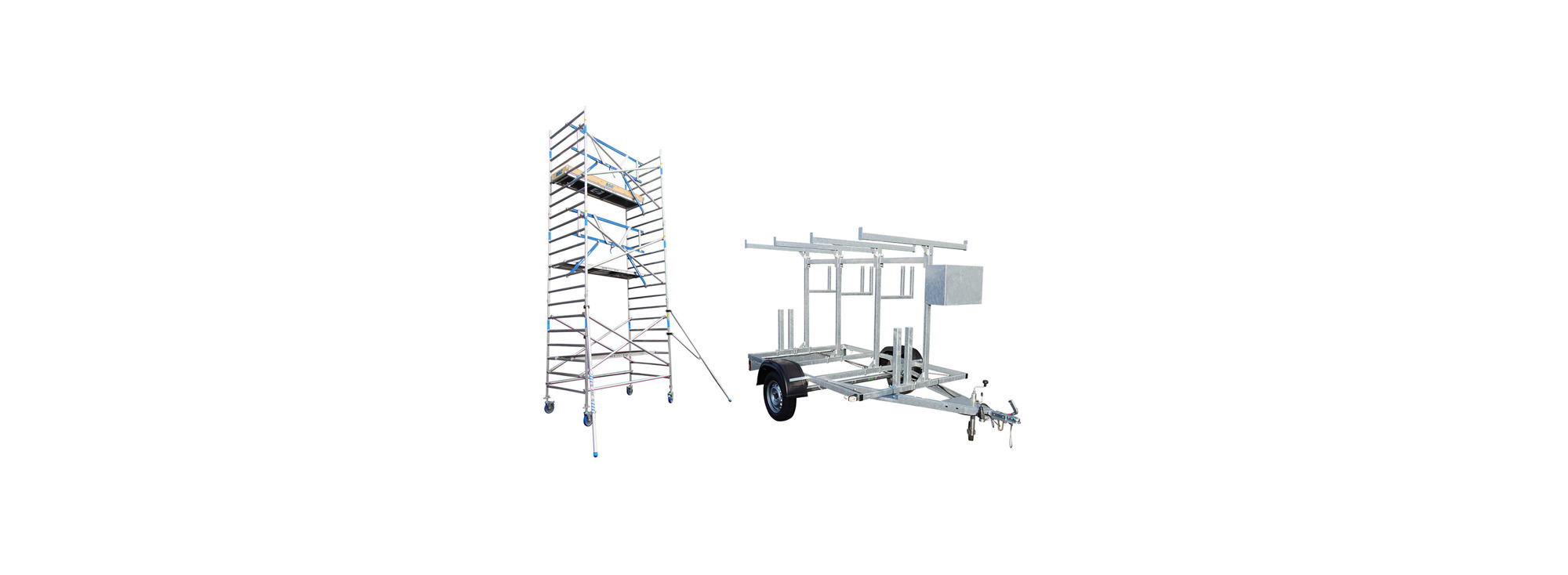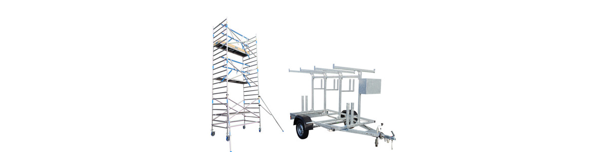 Professionele aluminium rolsteiger 135 x 250 cm met houten platformen inclusief hoge kwaliteit Basic Carrier aanhangwagen, speciaal voor veilig transport uw rolsteiger en bijbehorende onderdelen.